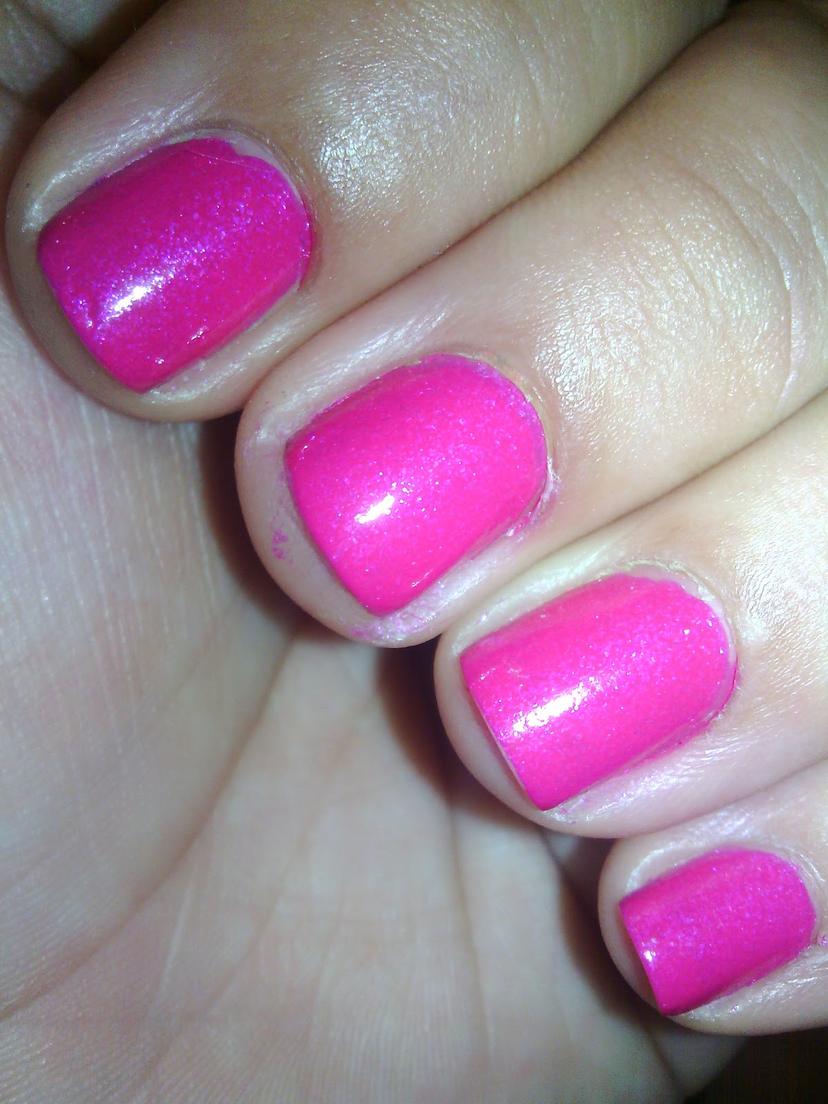 Apple Kid is a bright and rosy fuchsia creme with pink and blue shimmer. Great application and dry time for a creme. I used I Miss You as a top coat over Apple Kid in the 2 pictures below.